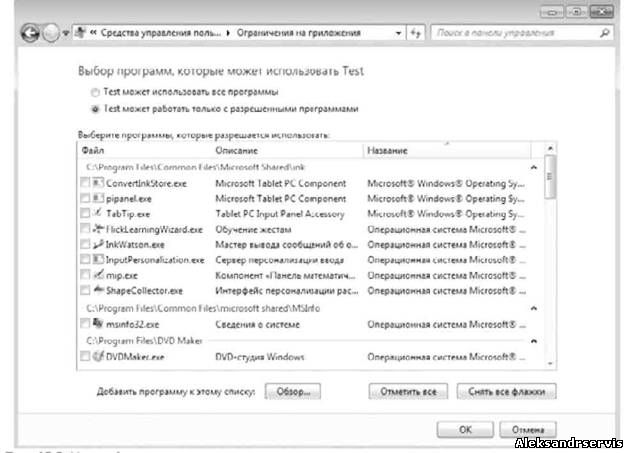 После того как список программ будет сформирован, вам нужно будет отметить те из них, какие разрешено запускать пользователю. В этом вам могут помочь кнопки Отметить все иСнять все флажки. С помощью первой можно отметить сразу все программы в списке, а с помощью второй -снять выделение. Может случиться так, что в список могут не попасть некоторые программы. Это объясняется достаточно просто: некоторые программы не требуют установки и могут начинать работу сразу же после запуска управляющего файла. Примером таких приложений могут быть некоторые игры, которые можно просто перенести на flash-накопителе или любом оптическом диске.