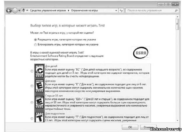 р В игры с какой оценкой может играть <имя учетной записи>? Механизм родительского контроля в своей работе использует статистические данные негосударственной организации ESRB (Entertainment Software Rating Board), которая занимается определением рейтингов компьютерных видеоигр и других приложений, распространяющихся на территории США и Канады. Организация работает с 1994 года и за это время проанализировала более десяти тысяч приложений, поэтому ее оценкам вполне можно доверять, даже несмотря на территориальные ограничения. На выбор пользователя представляется шесть категорий, ориентированных на определенный возраст